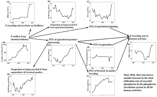 Dynamics of phosphorus resource reuse in China during the period of 1990–2019. (a) P recycling rate in straws as fertilizers; (b) Proportion of using recycled P from agricultural planting; (c) PUE of agricultural planting; (d) P outflow from chemical industry; (e) PUE of agricultural product processing; (f) PUE of aquaculture; (g) P recycling rate in human activities; (h) Proportion of using recycled P from aquaculture & livestock poultry; (i) PUE of livestock & poultry breeding.