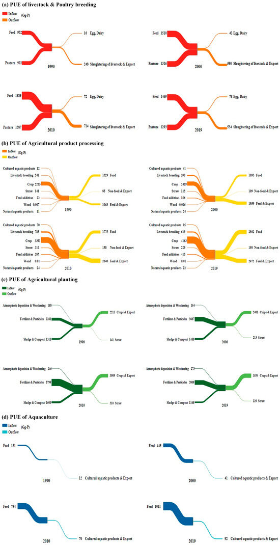 In terms of P resource utilization efficiency, an overall upward trend is observed, with PUE increasing from 14% in 1990 to 22% in 2019 (Table 4). This is attributed to the Chinese government’s strengthening of fertilizer use management and the increasing technology advancement of poultry production, such as large-scaling and intensification of breeding [48]. Despite this, China still lags behind the most developed agricultural countries in terms of the utilization of P resources. [49,50].