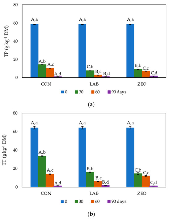 TP (a) and TT (b) content during 90 days of ensiling. Results are expressed as average values ± standard errors (CON-control; LAB-inoculum of lactic acid bacteria; ZEO-zeolite); n = 3. A–C The same superscript capital letters within a row denote no significant differences (p > 0.05) between the values obtained for the different treatments regarding the control sample according to Tukey’s ANOVA. a–d The same superscript lowercase letters within a column denote no significant differences (p > 0.05) between values obtained for different days of storage according to Tukey’s ANOVA.