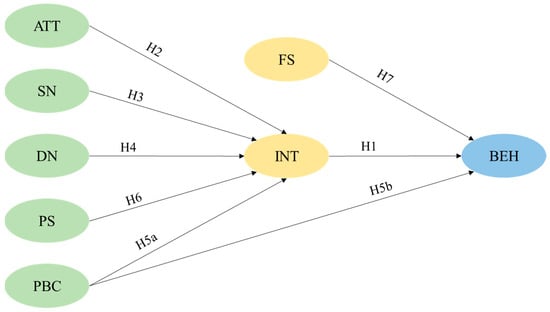 This coefficient assesses the predictive ability of the model [60], with an R2 value of 0.394 for intention and 0.404 for behavior. According to the criteria proposed by Chin [63], the model achieves moderate explanatory strength for both intention and behavior. In addition, we evaluated the effect size f2, the results of which are shown in Table 6. Based on Cohen’s [64] established criteria, effect sizes can be categorized as small, medium, or large when the values of f2 are 0.02, 0.15, and 0.35, respectively. Based on this standard, the INT→BEH effect was of medium size, while the effects of ATT→INT, PBC→INT, DN→INT, and FS→BEH were small. The effects of SN→INT, PS→INT, and PBC→BEH could be considered negligible. In conclusion, we assumed that H1, H2, H3, H4, H5a, and H7 are valid, while H5b and H6 are not.