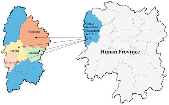 This study selected four counties, namely Guzhang, Baojing, Huayuan, and Yongshun, in Xiangxi Tujia and Miao Autonomous Prefecture as the research area, located in the northwest region of Hunan Province in central China (see Figure 2). The reason for choosing these four counties is that they are all certified poverty alleviation counties for organic products in China, and they have favorable natural conditions for the development of organic agriculture. The local governments support the development of organic agriculture to help farmers escape poverty. Moreover, these local governments are considering further supporting the promotion of organic agriculture and need to understand the factors driving farmers’ adoption of OF. From June to September 2020, we conducted a questionnaire survey on farmers’ intentions to adopt OF. According to the total number of organic farming households (including conversion and certified farmers) obtained from the local government agricultural departments in the four counties, a total of 386 households were included (124 in Guzhang, 144 in Baojing, 41 in Huayuan, and 77 in Yongshun). According to the recommendations of Cochran [56] and Singh and Masuku [57], with a 95% confidence level, the minimum sample size of organic farmers in each county was determined using a sample size calculator (62 in Guzhang, 72 in Baojing, 20 in Huayuan, and 38 in Yongshun), and in the same proportion to determine the sample size of conventional farmers. Considering the possibility of invalid questionnaires, 120% of the minimum sample size was distributed, resulting in a total of 476 questionnaires. Then, a stratified proportional sampling method was used to sample organic farmers in each county’s townships, and structured survey questionnaires were distributed to voluntary participants to collect data. Conventional farmers were also sampled around the organic farming sample. The selection of conventional farmers adjacent to organic farmers as sampling subjects is because these farmers should have considered whether to adopt OF techniques and can provide valid information. All respondents in this study were household heads, because they usually play a dominant role in production decision-making in farming households. Invalid questionnaires with obvious contradictions, incomplete responses, or obvious patterns were excluded. Finally, 450 valid questionnaires were collected, with an effective rate of 95%. One year later, we conducted follow-up visits to the 450 farmers who were interviewed and provided valid questionnaires in the first stage through a combination of household visits and telephone surveys to collect data on the conversion of intention into behavior. A total of 432 valid questionnaires were obtained, with an effective rate of 96%. The reason for choosing a one-year interval for predicting the intention–behavior relationship is mainly due to concerns that the effectiveness of the prediction may be affected by changes in policy circumstances over a long time interval.