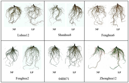 The root length of the six peanut varieties had extremely significantly increased under LP conditions compared with those under NP conditions (Figure 1, Table 3). There were significant differences in root length among the different peanut varieties under the same phosphorus level (p < 0.001). Under LP conditions, the root length of the high-efficiency varieties were significantly longer than those of the low-efficiency varieties. The root length of the three high-efficiency varieties was 18.31% higher than that of the three low-efficiency varieties. There were extremely significant differences in root surface area among the treatments and varieties. Compared with that under NP conditions, the root surface area of the efficient variety Fenghua 6 under LP conditions increased by 19.54%, while that of the inefficient variety Fenghua 2 decreased by 2.06%. There were significant differences in root volume, average root diameter, and root tip number among the different peanut varieties under conditions with the same phosphorus level. However, there were no significant differences in root volume, mean root diameter, and number of root tips between LP and NP for the same varieties. Comparing the same peanut variety under LP and NP conditions (Table 3), the root length and root surface area of the six peanut varieties under LP conditions were significantly higher than those under NP conditions, but their root volume, mean diameter, and root tips were not significantly higher than those under NP conditions.