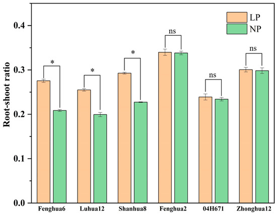 Root–shoot ratio of six peanut varieties under NP and LP conditions. Note: “*” represents significant differences between the two treatments, while “ns” represents insignificant differences between the two treatments.