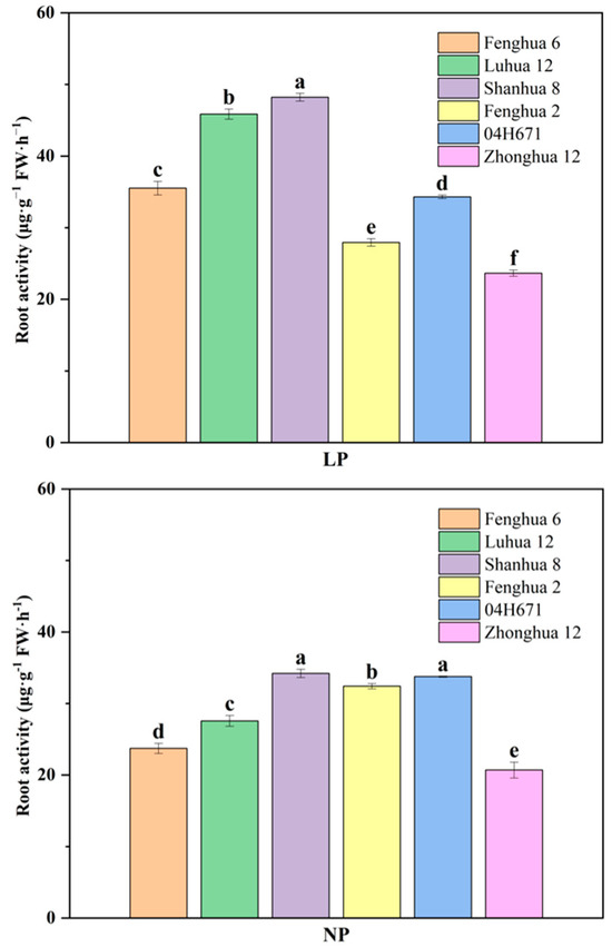 Root activity of six peanut varieties under NP and LP conditions. Note: The different lowercase letter indicates that the difference has reached a significant level (p < 0.05).
