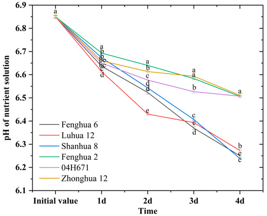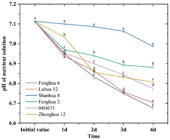While being treated for 16 to 20 d, the nutrient solution pH values of each treatment were determined daily using a pH meter. Each treatment had three replicates, and each replicate was measured three times.