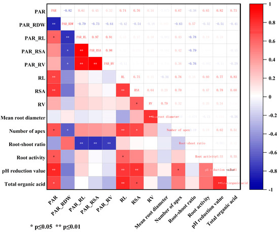 According to Figure 6, the P activation amount per plant was significantly positively correlated with the P activation rate per root length (0.61 *), root tip number (0.67 *), and root activity (0.65 *). It was very significantly positively correlated with root length (0.74 **), root surface area (0.76 **), the pH reduction value of the nutrient solution (0.82 **), and the organic acid amount secreted by roots (0.86 **) but very significant negatively correlated with P activation rate per root dry weight (−0.82 *). Additionally, the reduction in nutrient solution pH was very significant positively correlated with root length (0.77 **), root surface area (0.78 **), the amount of organic acids secreted by roots (0.82 **), and the number of root tips (0.62 **).