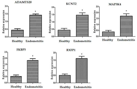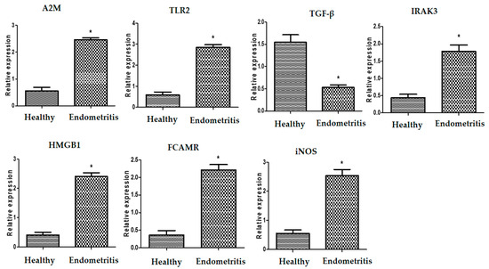 Different transcript intensities of immune genes between normal and endometritis ewes. When p < 0.05, the asterisk (*) indicates significance.