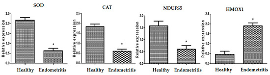 Different transcript intensities of antioxidant genes between normal and endometritis ewes. When p < 0.05, the asterisk (*) indicates significance.