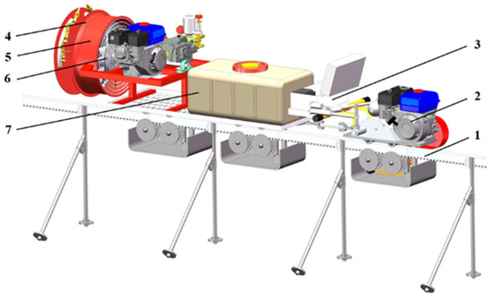 Single-track remote-controlled self-propelled sprayer. 1—track, 2—track tractor, 3—control box, 4—arc-shaped air outlet, 5—air duct, 6—fan, and 7—spray tank.