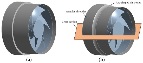 The arc-shaped air outlet is an arc-shaped structure designed at the connection between the air duct and the annular air outlet. To study the influence of the arc-shaped air outlet on the wind speed of the air-assisted system, a CFD simulation was carried out for the air-assisted system.