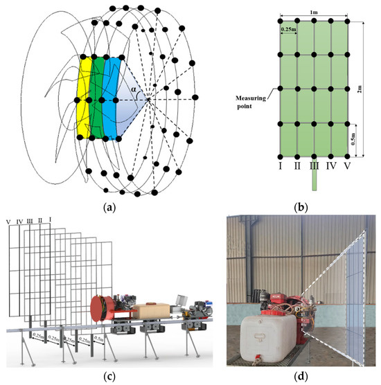 According to “GB/T 24683-2009 Plant Protection Machinery—Test Method for shrub and tree Crops Air-fed sprayer” [27], and combined with the reasonable planting density of the spindle-shaped apple trees in Shandong Agricultural University’s experimental field, performance tests were carried out on the air-assisted system of the track sprayer with wind power optimization. According to the above simulation results, the arc-shaped air outlet with different parameters was designed and processed. Wind speed measurements were carried out at the annular air outlet port of the air-assisted system and in the external airflow field using the DLY-1602C integrated anemometer (Tai’an Dali West Group Company, Tai’an, China). The annular air outlet was divided into four circular planes with equal distances, and 12 points with the same central Angle α = 30° were taken as the measuring points on each circular plane. A measuring frame was formed by selecting a horizontal section of 1 m and a vertical section of 2 m on one side with the track as the axis. Five frames were set with distances from the track of 0.5, 0.75, 1, 1.25, and 1.5 m, respectively. In total, 25 measuring points were taken at horizontal intervals of 0.25 m and vertical intervals of 0.5 m on each frame as measuring points. The DLY-1602C integrated anemometer was positioned directly facing the air outlet of the sprayer’s air-assisted system, maintaining parallel alignment between the anemometer and the measurement frame. The anemometer’s anemometry probe remained stationary at each measurement point for 5 s, and the measurement was repeated 3 times to obtain the average value as the measurement result to ensure the accuracy of the data. The arrangement of wind speed measurements is shown in Figure 4.