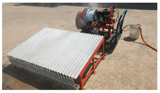 According to the standard “GB/T20183.2-2006 for Plant Protection Machinery—Spraying Equipment” [28], a fog collection chamber was utilized to gather droplets. The evaluation of the droplet drift prevention performance after the structural optimization was based on the measurements of droplet drift rate and mass center distance. The ambient temperature during the experiment ranged from 20 to 22 degrees Celsius, with a natural wind speed between 0.5 and 1 m/s. The fog collection chamber was set at an overall inclination angle of 10° and featured a total of 30 V-shaped slots. Each V-shaped slot was aligned with a graduated cylinder to collect the deposition of droplets from individual slots. The position of the collection chamber was adjusted to align the nozzle precisely at the center of the collection chamber. The stopwatch regulated a spray duration of 10 s with a spraying distance of 30 cm, using water as a substitute for the spray medium. Each experimental set was repeated three times to obtain an average value. Data were collected and recorded at the conclusion of each trial, and the experimental setup is illustrated in Figure 5.