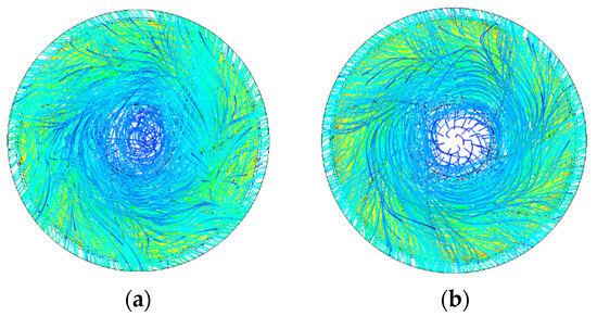 Upon the convergence of the CFD calculations, the streamlined diagrams of the air-assisted system were obtained, as shown in Figure 6. In air-assisted systems that lack an arc-shaped air outlet, the presence of numerous and densely packed low-speed streamlines, coupled with the axial flow resistance posed by circular baffles, results in the concentration of said low-speed streamlines in the central regions of the ducts and the formation of turbulent flow patterns. The optimization design of the arc-shaped air outlet significantly reduced the number of low-speed streamlines at the center position of the air duct in the air delivery system and diffused towards the annular air outlet. The comparison before and after demonstrates that the arc-shaped air outlet design reduced the generation of gas turbulent state and played a certain role in diverting the airflow produced by the fan. After the structural optimization, the airflow streamline became more streamlined.