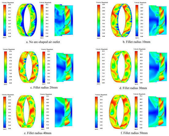 To investigate the optimal circular radius of the arc-shaped air outlet, simulations were conducted for the different circular radii of the arc-shaped outlet design. Circular radii of 10, 20, 30, 40, 50, 60, and 70 mm were utilized, and Figure 7 shows the simulated velocity cloud diagrams of the horizontal cross-section of the air-assisted system and the annular air outlet.