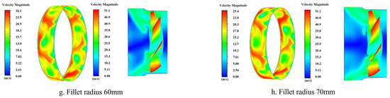 The comparison between Figure 7a,b shows that the cross-section of the no arc-shaped air outlet has an obvious zero-speed area at the corner of the connection between the air duct and the air outlet, and the wind speed cloud image of the annular air outlet is more obvious. The low-speed area covers the entire edge area of the air outlet. After the design of the structure of the arc-shaped air outlet with a rounded radius of 10 mm, the zero-speed area at the corner of the transverse section decreases. The low-speed area of the annular outlet is also significantly reduced, and the uniformity of the wind speed distribution is greatly improved compared to that before the structure optimization. With an increase in the fillet radius, the flow field inside the duct becomes more uniform and stable, and the low-speed area gradually decreases to basically disappear.