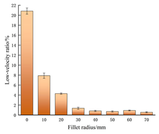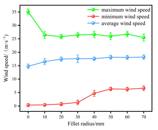 From the point-line graph of wind speed variations, it can be observed that, as the corner radius increases, the maximum wind speed stabilizes at around 26 m/s after a significant decrease, while the minimum wind speed slowly increases and stabilizes at around 6 m/s when the corner radius is 50 mm; the average wind speed at the exit shows an increasing trend, rising from 14.95 to 18.20 m/s. The bar graph of the low-speed zone shows that the proportion of the low-speed zone gradually decreases from 20.83% to 0.71%, and the low-speed zone area stabilizes at the corner radius of 50 mm. Through the above data analysis, when the fillet radius reaches 50 mm, all aspects of the data display reach their best.