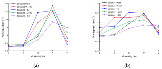 In the analysis of the external airflow field, reliability, and credibility based on simulation models, the optimized air-assisted system with an arc-shaped air outlet with radius of 50 mm and the air-assisted system without an arc-shaped air outlet were selected for the field measurement. The operation of the fan of the air-assisted system was adjusted to maintain a low rotational speed and improve the stability of the data. Data were recorded for each point on five measuring racks in an external airflow field, and the average wind speeds on the longitudinal lines of the five racks, designated as I, II, III, IV, and V, were calculated at five measuring points. These averages were used to determine the average wind speed at different distances from the track on the longitudinal lines. The experimental results before and after the optimization are shown in Figure 10 below.