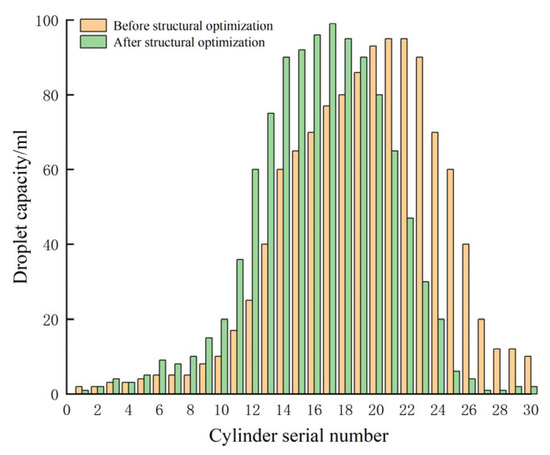 The data were imported into Origin software to integrate and illustrate the droplet distribution before and after the structural optimization, as shown in Figure 12. From the figure, it can be observed that, prior to structural optimization, the peak distribution of droplets was primarily concentrated around the 22nd graduated cylinder. The droplet quantity on the right side of the collection chamber was higher than that on the left side. The optimization of the arc-shaped air outlet resulted in a leftward shift of the droplet peak, concentrating around the 16th graduated cylinder. Moreover, the quantity of droplets on the right side noticeably decreased compared to pre-optimization. Upon data integration, the droplet drift rate and mass center distance after structural optimization were calculated as 16.5% and 246 mm, respectively. These values decreased by 31.5% and 16.3%, respectively, compared to pre-optimization. These data, in conjunction with pertinent experimental studies, provide substantial and effective experimental results [29,30]. The results indicate that the structural optimization of the arc-shaped air outlet reduced the phenomenon of droplet drift towards one side, effectively confining the range of droplet deposition and reducing the droplet drift rate.