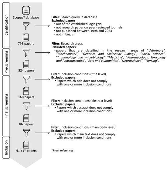 The literature database adopted for this research was Scopus®. The search was limited to English research papers that were published in peer-reviewed scientific journals. This criterion was set since these publications were considered of higher quality than grey literature, tertiary literature, and conference papers. A 25-year time span was considered for the research. Thus, only papers published between 1998 and 2023 were included in the research.