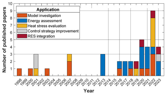 In Table 2, the 42 included papers are organized according to the previously identified categories of application. From the table, it stands out that model investigation is a common application of BES models. The aim of several works, in fact, is investigating how to develop a BES model for specific or generic livestock houses. This is more common in the oldest works included in this review that aimed at establishing the first methodologies for the energy simulation of livestock houses. Examples of this type of work are the ones of Cooper et al. [40] and Liberati and Zappavigna [41]. Both aimed at developing a general methodology for the energy simulation of generic livestock houses with mechanical or natural ventilation. Other works focus on specific modeling aspects rather than general modelling methodologies. For example, Lee et al. [42] focused on how to estimate the evaporation rate from duck-house litter, while Shin et al. [43] specifically focused on how to calibrate the modeled fan electrical energy consumption.