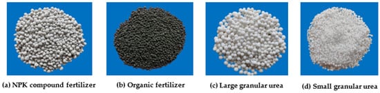The fertilizer samples selected for the study are compound fertilizer of nitrogen, phosphorus, and potassium (NPK compound fertilizer) produced by Hebei Jiheng Group Co., Ltd. (Hengshui, China) (main components of nitrate nitrogen, P2O5, K2O, the total nutrients ≥ 45%, water content of 1.88%), organic fertilizer produced by Liaoning Jiaji Crop Nutrition Co., Ltd. (Shenyang, China). (organic matter content ≥ 40%, N-P2O5-K2O content ≥ 5%, water content of 2.49%), large granular urea produced by China National Coal Group Corp. (Beijing, China) (water content of 0.83%), and small granular urea produced by CNOOC Tianye Chemical Co., Ltd. (Huhehaote, China) (water content of 0.66%) (as shown in Figure 1).