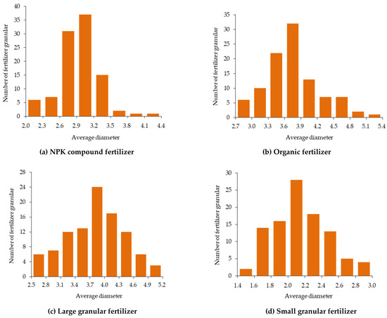 The size distribution of fertilizer granules was obtained based on triaxial dimensions measurement and geometric mean diameter calculation of fertilizer grains (as shown in Figure 2) [16]. Three typical sizes from the size range of intensive fertilizer granules are selected for the impact test, and the size error of the selected fertilizer particles was controlled within ±0.1 mm (as shown in Table 1).