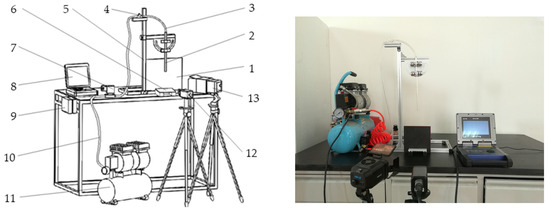 In this study, DL91150 digital Vernier caliper (Deli Group Co., Ltd., Ningbo, China). (accuracy of 0.01 mm) was used to measure the three-axis size of fertilizer granules; the Shuangjie JJ523BC electronic precision balance (Beijing Jinkelida Electronic Technology Co., Ltd., Beijing, China) (maximum range of 500 g, accuracy of 0.001 g) and measuring cylinder were used to measure the density of fertilizer; and a TMS-Pro texture analyzer (FTC Co., Ltd., London, OH, USA) was used in the static compression test of fertilizer particles. An image capture system for recording fertilizer granule impact process (Figure 3) was designed for the impact test. The image is captured using a high-speed camera PLEXLOGGER (Shinano Kenshi Co., Ltd., Nagano-ken, Japan) (maximum shooting speed of 100,000 FPS; maximum resolution of SXGA (1280 × 1024)), which mainly consists of camera, built-in light source, and analyzer.