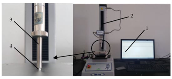 Fertilizer particle compression test: 1. computer; 2. texture analyzer; 3. indenter; 4. fertilizer particle.