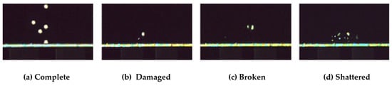 It was observed from the trial test that the state of different types of fertilizer granules with different sizes were similar after impacting on the target board. The four typical states of large granules of urea captured by high-speed camera at a shooting frequency of 16,000 FPS after impacting on a 304 stainless steel board are shown in Figure 5. With gradual increase in the collision speed, four typical conditions, complete (the particles bounce), damaged, broken, and shattered, of the fertilizer granules will appear. When bounce occurs, the main body of granule is complete; when damage occurs, there will be small fragments off granule after impact, but the change is not obvious, and the main body of the granule still exists; when the impact speed increases, the fertilizer grains break into some large pieces (broken state); when the speed increases further, the fertilizer granules may shatter into small pieces, and the main body of the granule no longer exists.