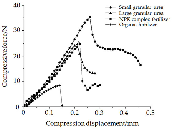 Figure 6 shows the typical compressive force-deformation curve of the four typical fertilizer granules. It can be observed that the four kinds of fertilizer granules have great differences in compressive strength, but the compressive failure characteristics are similar. In the early stage of loading, the relationship between the compression force and deformation of the fertilizer grain is basically linear, indicating that the fertilizer granules are elastic in this stage. When the compressive force on the fertilizer granules reaches a peak value, cracks will appear on the fertilizer granules and they would rapidly develop and connect together, which would cause the splitting of the fertilizer granules, resulting in a rapid reduction in compression force. There are no obvious yield points from the elastic deformation to the failure of the fertilizer grains.