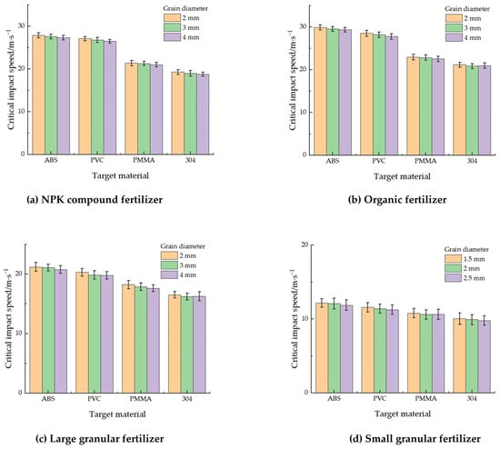 It can be seen from Figure 7 that, generally, the critical impact speed of each variety of fertilizer decreases gradually with the increase in fertilizer granule size. The reason might be that there are some defects such as cracks and micropores in the production process of the fertilizer; the breakage of the fertilizer granules is mainly related to the accumulation of internal defects as a kind of brittle material [23,26,28,29]. The smaller the sizes of the fertilizer granules, the smaller the internal defects and the lower the density of the defects. Therefore, the overall strength of small-sized fertilizers was higher than that of large-sized fertilizers of the same variety [30,31]. However, the decrease in the critical impact speed does not increase significantly with the increase in granule size.