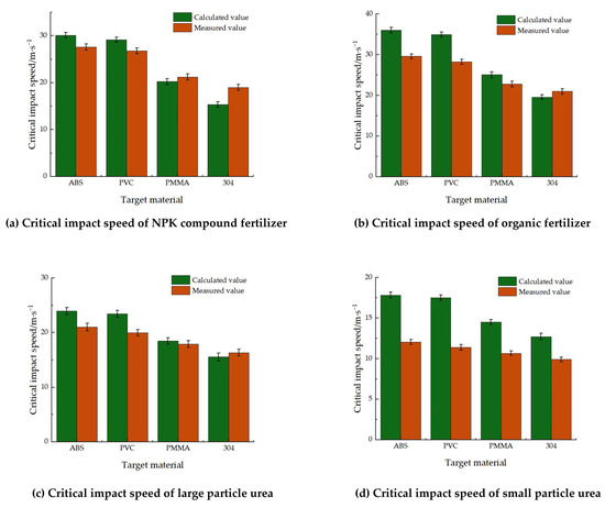 It can be obtained from the analysis above that the granule size of the fertilizer basically does not affect the critical impact speed. Therefore, the average value of the critical impact speed of the fertilizer granules of the same variety with different size grades impacting on a certain material target board can be taken as its critical impact speed. The comparison and analysis of the difference between the theoretical and the measured value of the critical impact speed is shown in Figure 8. It can be observed that the calculated values of the critical impact speed of the fertilizers, except small urea, are not always greater than the measured values. The calculated values of the critical impact speed are all greater than the measured values of the small urea and the reason may be related to the strain rate effect and the impact damage mechanism of the brittle materials [30,31].