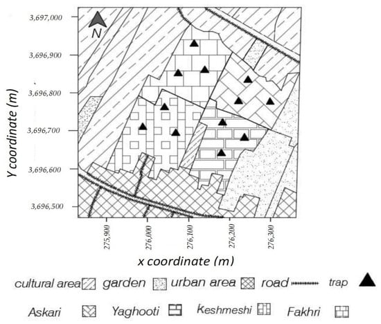 - Sciarretta, A.; Zinni, A.; Mazzocchetti, A.; Trematerra, P. Spatial analysis of Lobesia botrana (Lepidoptera: Tortricidae) male population in a mediterranean agricultural landscape in Central Italy. Environ. Entomol. 2008, 37, 382–390. [Google Scholar] [CrossRef][Green Version]