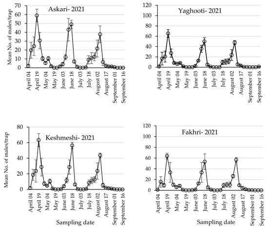 In 2021, three flight peaks were recorded corresponding to three generations of L. botrana. In all cultivars, capture started on 4 April 2021, and after that, the number of captured male adults in the traps increased, and on 19 April 2021, the flight peak of the first generation occurred at the time of the bud burst. At this date, each trap caught a mean number of 59.00 ± 7.09, 65.33 ± 7.53, 63.33 ± 8.33, and 63.66 ± 5.33 males per trap in Askari, Yaghooti, Keshmeshi, and Fakhri vineyards, respectively. After that, the population of male adults gradually decreased, indicating the end of the first-generation population. In mid-June, the number of males captured in the traps increased again, indicating the occurrence of the second generation at the time of ripening. On 18 June 2021, the mean number of 49.00 ± 4.72, 50.00 ± 7.09, 56.33 ± 4.17, and 53.33 ± 14.53 males per trap were reported in the traps installed in Askari, Yaghooti, Keshmeshi, and Fakhri vineyards, respectively. In August, the number of captured males increased, and the flight peak of the third generation was observed on 7 August 2021. At this date, the mean number of 37.66 ± 9.53, 47.66 ± 3.84, 43.66 ± 2.96, and 56.66 ± 4.40 males per trap were captured in each trap in Askari, Yaghooti, Keshmeshi, and Fakhri vineyards, respectively (Figure 2; Table 3).