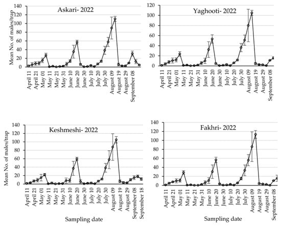 In 2022, similar to 2021, three flight peaks were observed corresponding to three generations of L. botrana. In all cultivars, males captured started on 11 April 2022, and after that, the number of captured male adults in the traps increased, and after that the number of captured male adults in the traps increased, and on 6 May 2022, the flight peak of the first generation occurred. At this date, each trap caught a mean number of 27.33 ± 4.33, 23.67 ± 4.66, 22.00 ± 3.00, and 28.66 ± 4.09 males per trap in Askari, Yaghooti, Keshmeshi, and Fakhri vineyards, respectively. The number of males captured in the traps increased again, indicating the second flight on 20 June 2022. The mean number of 57.33 ± 4.33, 53.33 ± 8.25, 59.33 ± 4.05, and 56.66 ± 6.00 males per trap were reported in the traps installed in Askari, Yaghooti, Keshmeshi, and Fakhri vineyards, respectively. In the mid-August, the flight of third-generation moths takes place. On 14 August, the mean number of 110.67 ± 5.78, 105.00± 5.00, 105.00 ± 7.63, and 113.33 ± 8.82 males per trap were captured in each trap in Askari, Yaghooti, Keshmeshi, and Fakhri vineyards, respectively. There was a sudden increase in the number of caught males from 3 September to 13 September 2022, and after that, the population decreased. It was not considered a generation (Figure 3; Table 3).