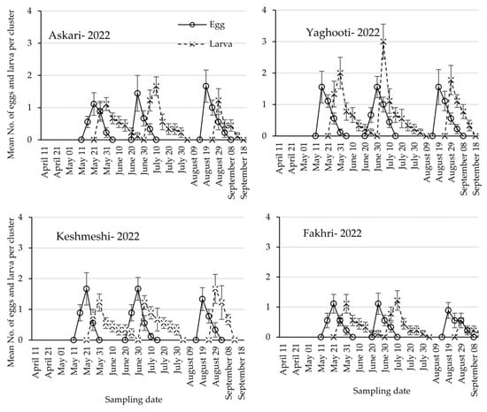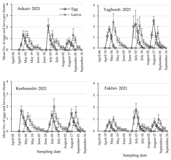 In 2022, the first generation of L. botrana laid a mean number of 1.11 ± 0.35, 1.55 ± 0.50, 1.66 ± 0.53, and 1.11 ± 0.31 eggs per cluster in Askari, Yaghooti, Keshmeshi, and Fakhri vineyards, respectively. The egg-laying occurred in mid-May to late May. Females of L. botrana started laying eggs for the second generation in late June, and the maximum number of eggs was observed for Keshmeshi (1.66 eggs per cluster), followed by Yaghooti (1.55 eggs per cluster) cultivars. Eggs of the third generation were observed in mid-August. For all the examined cultivars, the first-generation larvae hatched from eggs on 26 May 2022 and continued to late June. The maximum number of larvae was reported in the Yaghooti cultivar (2.00 larvae per cluster). Second-generation larvae hatched in early July and continued to early August. Third-generation larvae were present in vineyards from late August to mid-September (Figure 5).