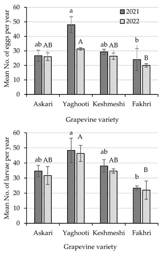 Mean number (±SE) of eggs, and first instar larvae in different varieties in the experimental years. Means followed by the same lowercase letters for 2021, and uppercase letters for 2022 are not significantly different using the Tukey–Kramer (HSD) test at p = 0.05.