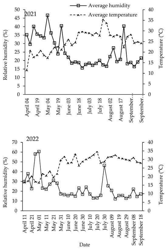 In 2021, there was a small amount of rain. The relative humidity increased in mid-April and reached about 49.38%, but after that, it had a decreasing trend, so the percentage of humidity reached less than 30% from mid-May 2021. In 2022, a similar trend was reported, and the rainfall was very low. The relative humidity increased at the end of April and was reported above 60% for a week. But after that, there was a decreasing trend, so the percentage of relative humidity reached less than 30% from early May and remained at this level until the end of September (Figure 7).