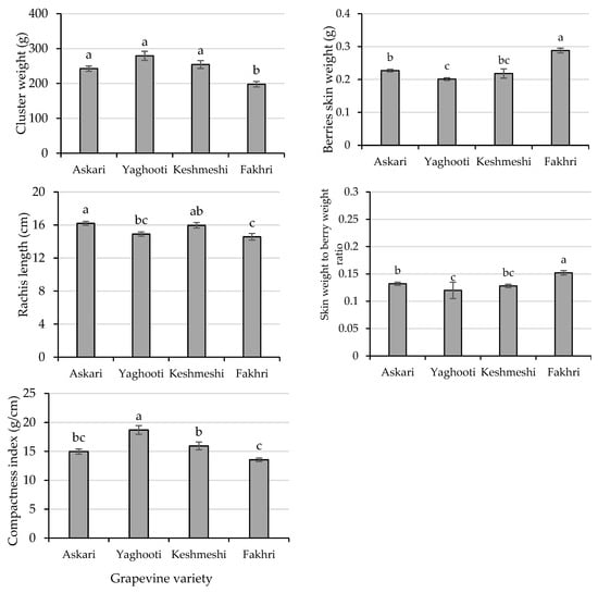 Morphological properties (mean ± SE) of berry clusters of different grape cultivars. Means followed by the same lowercase letters are not significantly different using the Tukey–Kramer (HSD) test at p = 0.05.