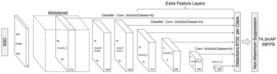 The SSD-MobileNet model is a fusion of the SSD-300 Single Shot MultiBox Detector (SSD) and the MobileNet convolutional neural network (CNN), resulting in a lightweight architecture that is ideally suited for resource-constrained environments, such as mobile and embedded vision applications (Figure 1). This integration combines the efficiency of SSD as an object detector, and MobileNet as a feature extractor, thus providing a high-performance yet computationally efficient solution.