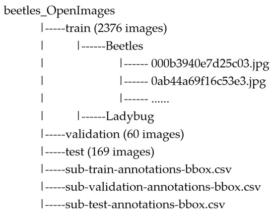 For the first transfer learning, the 2605 annotated images were downloaded from the Open Images platform. Files are structured according to the Open Images format requirements (Figure 2), namely, divided into three main directories (‘train’, ‘validation’ and ‘test’, with 2376, 60 and 169 images, respectively), and with csv metadata files.