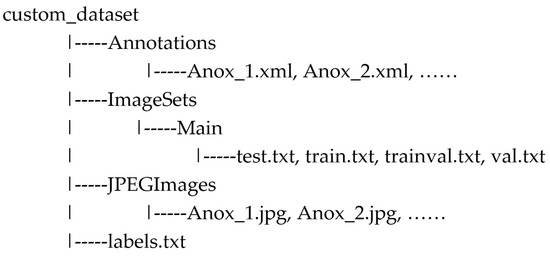 The ‘train_ssd.py’ script provides 29 distinct arguments for dataset balance, network architecture, loading pretrained basenet or checkpoints, fine-tuning Stochastic Gradient Descent parameters, scheduler for dynamic adjustment of the learning rate during training, and more. These arguments come with default values that proved to be appropriate for our specific training requirements. To test a potential further model refinement, a second round of transfer learning was undertaken. Our custom dataset was organized in accordance with the Pascal VOC format (Figure 3).