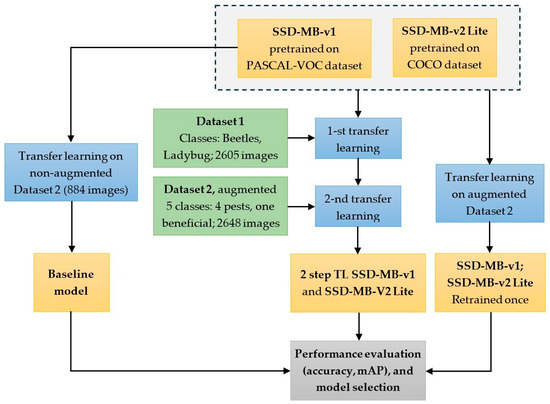 We aimed to assess the efficiency of the proposed two-step transfer learning (TL) procedure. The first TL training step was performed on a dataset of 2605 images to recalibrate the networks’ trainable parameters on the ‘Beetles’ and ‘Ladybug’ classes. Then, a second TL training step was performed on a distinct custom dataset of 2648 images with four classes of pests and one class for the beneficial ‘Ladybug’ insect, in order to fine-tune the trainable parameters for selected species of insects. The best-performing network was selected for the future research step aiming at employing a much larger and more representative custom dataset to reduce generalization error, as well as to test it onto an experimental model.