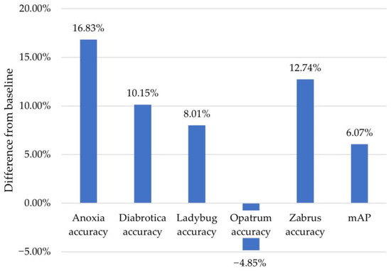 Not many studies, however, have explored the application of MobileNet networks in insect pest detection. Albanese et al. [23] utilized modified LeNet-5, VGG16 and MobileNetV2 on a dataset comprising 4400 images, specifically focusing on classifying the codling moth from other insects. The results indicated competitive accuracy levels, with LeNet-5 achieving 96.1%, VGG16 reaching 97.9% and MobileNetV2 demonstrating an accuracy of 95.1% and a precision of 98.5%. Similarly, Butera et al. [36] employed a Faster R-CNN with a MobileNet-v3 backbone for the detection of beetle-type crop pests and non-harmful beetles, leveraging a substantial dataset of 36,000 web-sourced images. The model exhibited strong performance, achieving a mean average precision (mAP) of 92.66%. Both studies showcased competitive accuracy in insect detection tasks using MobileNet models.
