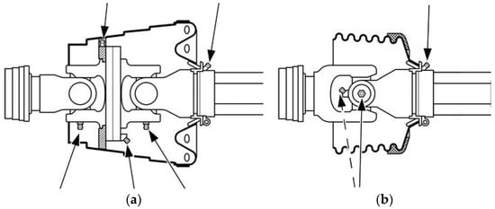 - Hilgers, M. Gelenkwelle(n). In Getriebe und Antriebsstrangauslegung; Hilgers, M., Ed.; Springer Vieweg: Wiesbaden, Germany, 2016; pp. 45–46. ISBN 978-3-658-12758-9. [Google Scholar]