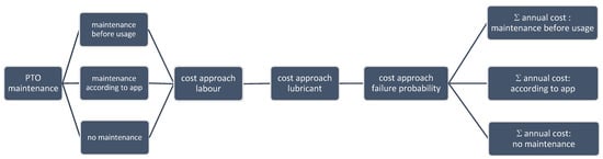 Cost calculation schematic for the maintenance of a PTO shaft for three maintenance scenarios.