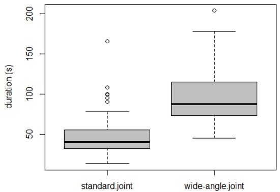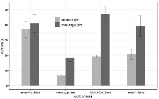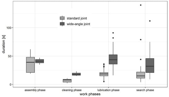 The mean time for the assembly phase was 37 s with a maximum of 62 s and a minimum of 19 s for a standard joint, and a mean time of 41 s with a maximum of 47 s and a minimum of 35 s for a wide-angle joint. For the lubrication phase of a standard joint, an average time of 19 s was needed with a maximum of 36 s and a minimum of 5 s, while the lubrication of a wide-angle joint needed 47 s on average with a maximum of 91 s and a minimum of 16 s (Table 2, Figure 5). Therefore, it can also be seen that, in general, the maintenance of wide-angle joints requires more time than the maintenance of standard joints.