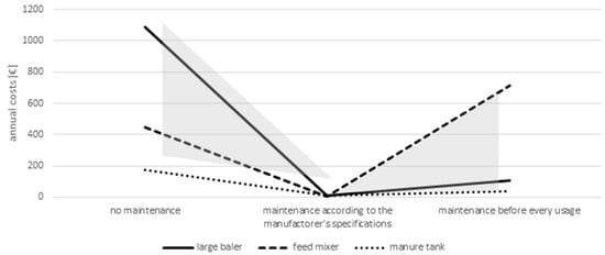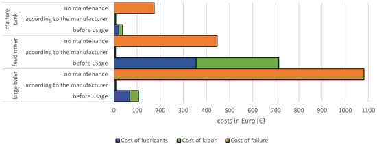 Regarding the feed mixer, with “maintenance before usage” 10.95 kg of grease will be used throughout the year per standard joint. Maintaining the joints as considered by the manufacturer’s specifications, every joint will be lubricated with only 0.11 kg of grease per year. The annual labor for “maintenance before usage” is 4.97 h per joint with an additional 7.0 h for assembly. Compared to this, the “maintenance according to the manufacturer’s specifications” needs 0.17 h for lubrication and assembly in total. Calculating the costs for “maintenance before usage”, a total of €711.01 is reached, consisting of €355.44 for lubricants and €355.57 for labor. Compared to this, the “maintenance according to the manufacturer’s specifications” approaches just 1% of the costs with €7.11 in total, consisting of €3.55 for lubricants and €3.56 for labor. For the feed mixer, the “no maintenance” scenario is not as costly as the “maintenance before usage” scenario with a cumulated cost of €446.52 for replacing the broken PTO shaft. This cost results from the lifetime reduction of omitted maintenance of 70%. Just as for the large baler, in the “no maintenance” scenario for the feed mixer, costs for lubrication and labor were not included, nor were any additional secondary costs applied. The results of the calculation for the feed mixer can be seen in Figure 6 as well.