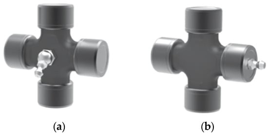 Positioning of grease zerk. (a) Centered in cross kit; (b) Assembled in the bearing cap on one arm of the cross kit [].