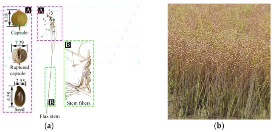 Flax plant structure and cultivation status: (a) flax plant structure; (b) status of flax cultivation, A: Flax capsule; B: Flax stem.